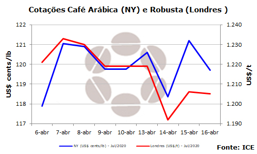 Na Bolsa de Nova York, o vencimento jul/2020 do contrato “C” recuou 5 pontos na comparação com o fechamento da semana anterior, encerrando a sessão de ontem a US$ 1,1970 por libra-peso. Na ICE Europe, o vencimento jul/2020 do café robusta fechou a US$ 1.205 por tonelada, com queda de US$ 14.