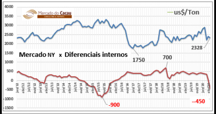 A safra oficial brasileira computada entre maio/20 e abril/21, determina uma previsão de entradas acima da média dos últimos três anos. O Estado do Pará, destaca-se sob a perspectiva de entregar mais uma produção recorde. Analistas comentam, que os números animadores para as colheitas nos próximos meses, também motivaram os processadores para aplicação dos deságios sobre os diferenciais NY.