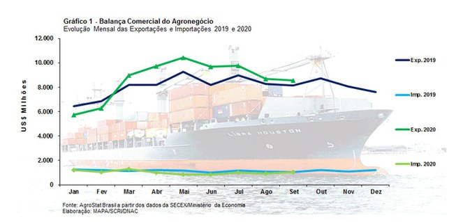 Entre janeiro e setembro de 2020 as exportações brasileiras do agronegócio somaram US$ 77,89 bilhões, o que representou crescimento de 7,5% em relação ao mesmo período em 2019. As importações do setor alcançaram US$ 9,18 bilhões, ou seja, 10,7% inferiores ao ano anterior.
