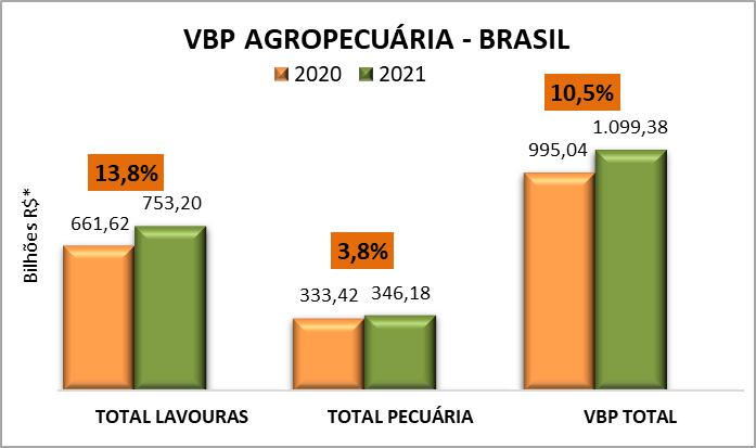 A estimativa do Valor Bruto da Produção Agropecuária (VBP) de 2021 é de R$ 1,099 trilhão, 10,5% acima do valor de 2020, que foi de R$ 995 bilhões. As lavouras representam R$ 753,2 bilhões e a pecuária, R$ 346,2 bilhões.