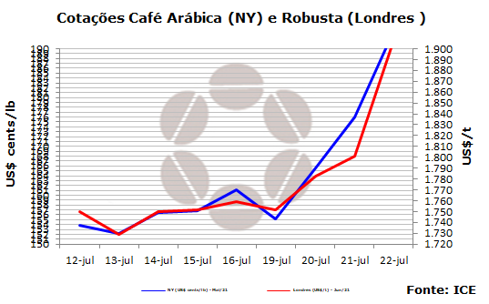 O vencimento setembro/21, na Bolsa de Nova York, fechou a US$ 1,9365 centavos de dólar por libra-peso, apresentando variação semanal positiva de 3.245 pontos. Na ICE Europe, o vencimento julho/21 do café subiu US$ 149,00, fechando a sessão da última quinta-feira (22) a US$ 1.908 por tonelada.