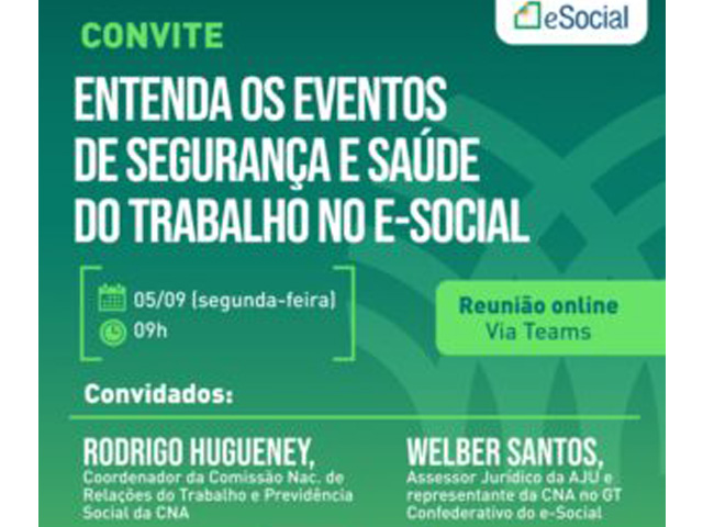 O encontro terá a participação do Coordenador da Comissão Nac. de Relações do Trabalho e Previdência Social da CNA, Rodrigo Hugueney, e também do Assessor Jurídico da AJU e representante da CNA no GT Confederativo do e-Social, Welber Santos.