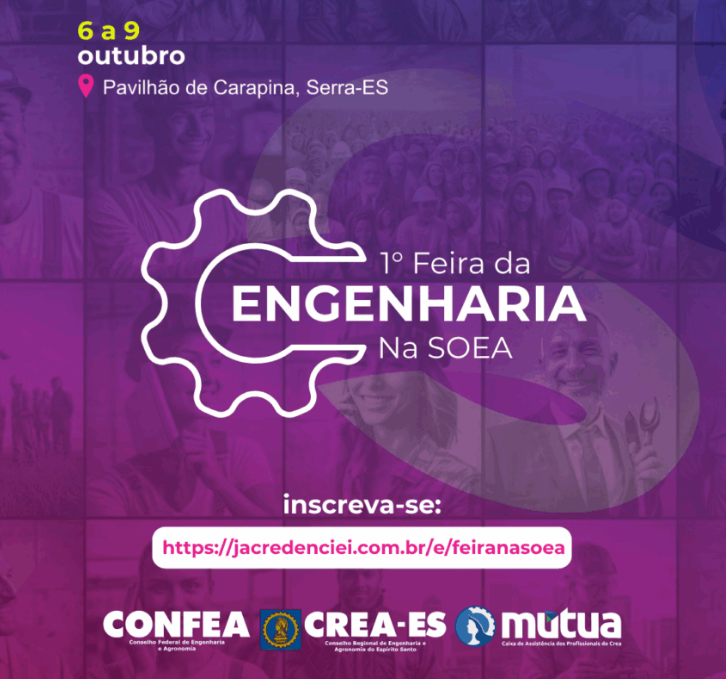 O Espírito Santo é palco de um dos maiores encontros da engenharia brasileira: a 1ª Feira da Engenharia, que se inicia hoje, de 6 a 9 de outubro, na área externa do Pavilhão de Carapina, na Serra (ES), em paralelo à 80ª Semana Oficial da Engenharia e da Agronomia (SOEA).